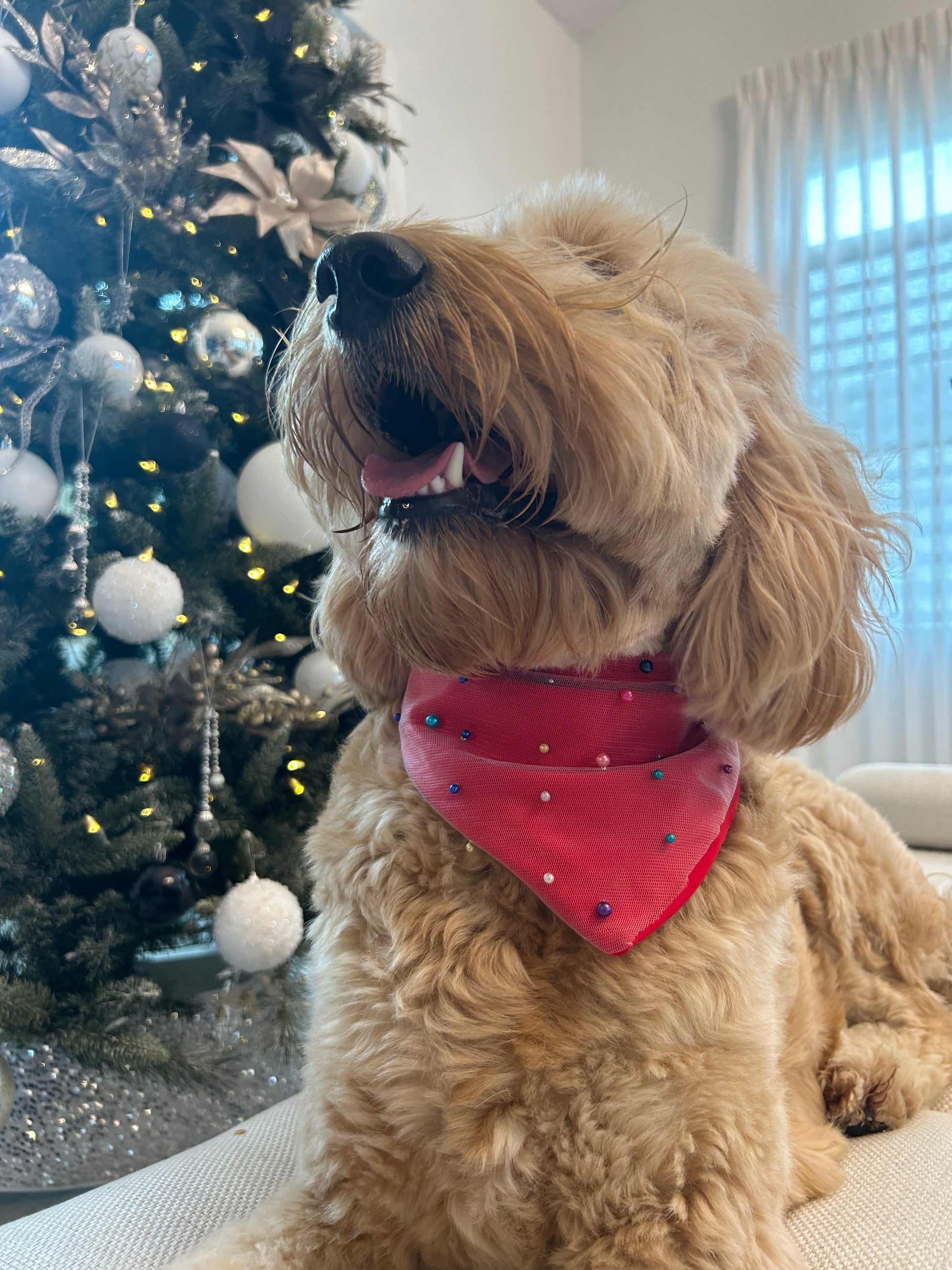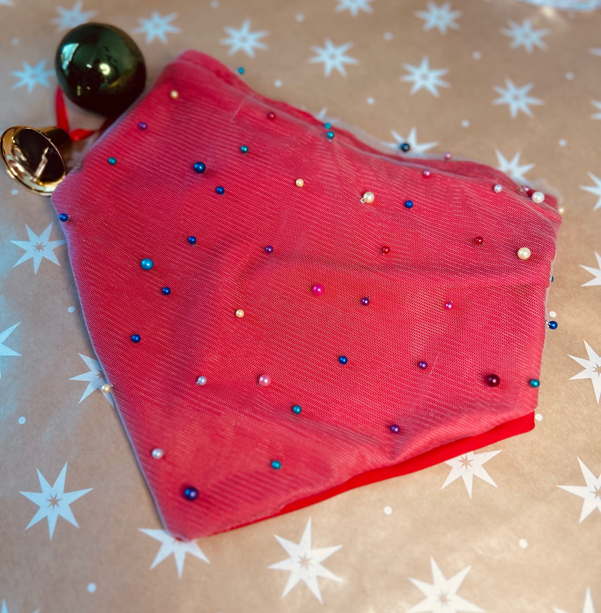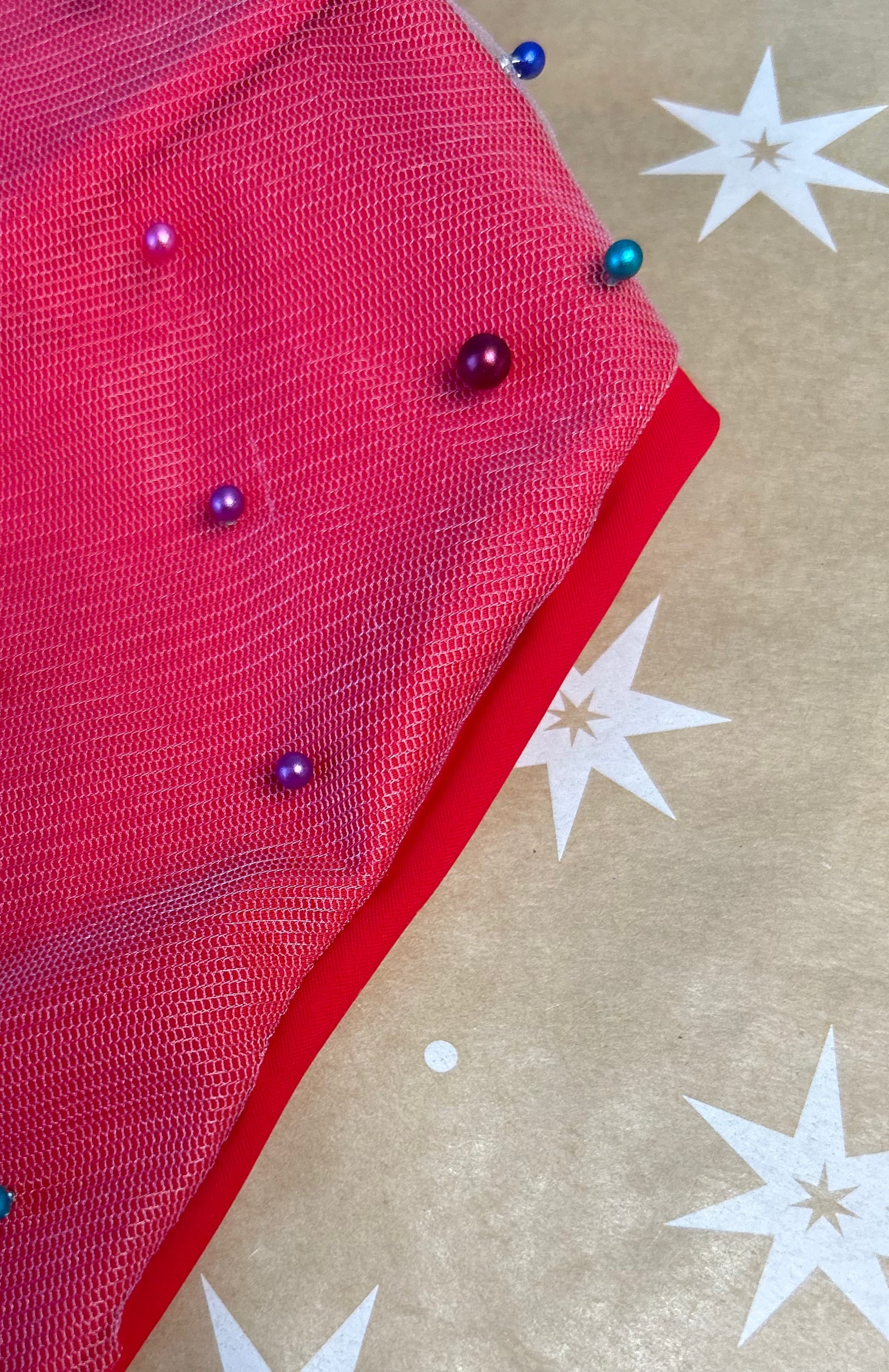 Byron is wearing a Red TECHNO SCUBA neoprene scuba fabric, accented with a veil of mesh and delicate decorations reminiscent of tiny Christmas ornaments. An ideal festive fashion choice!