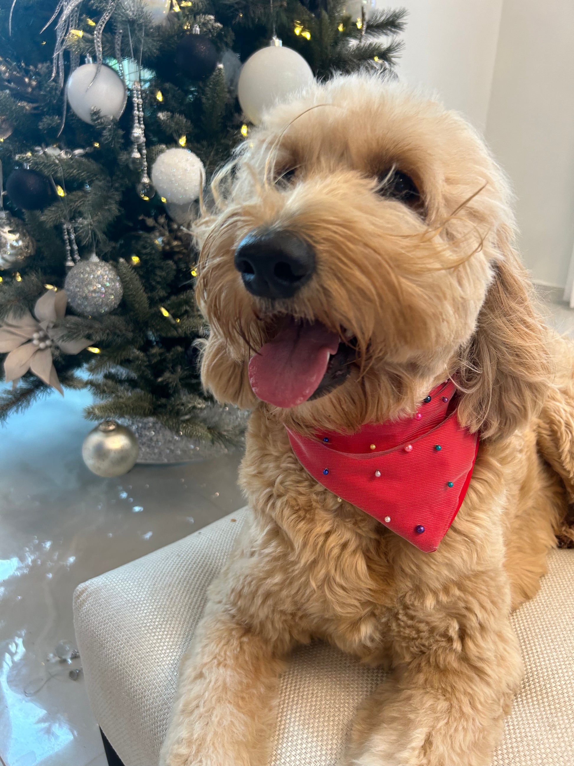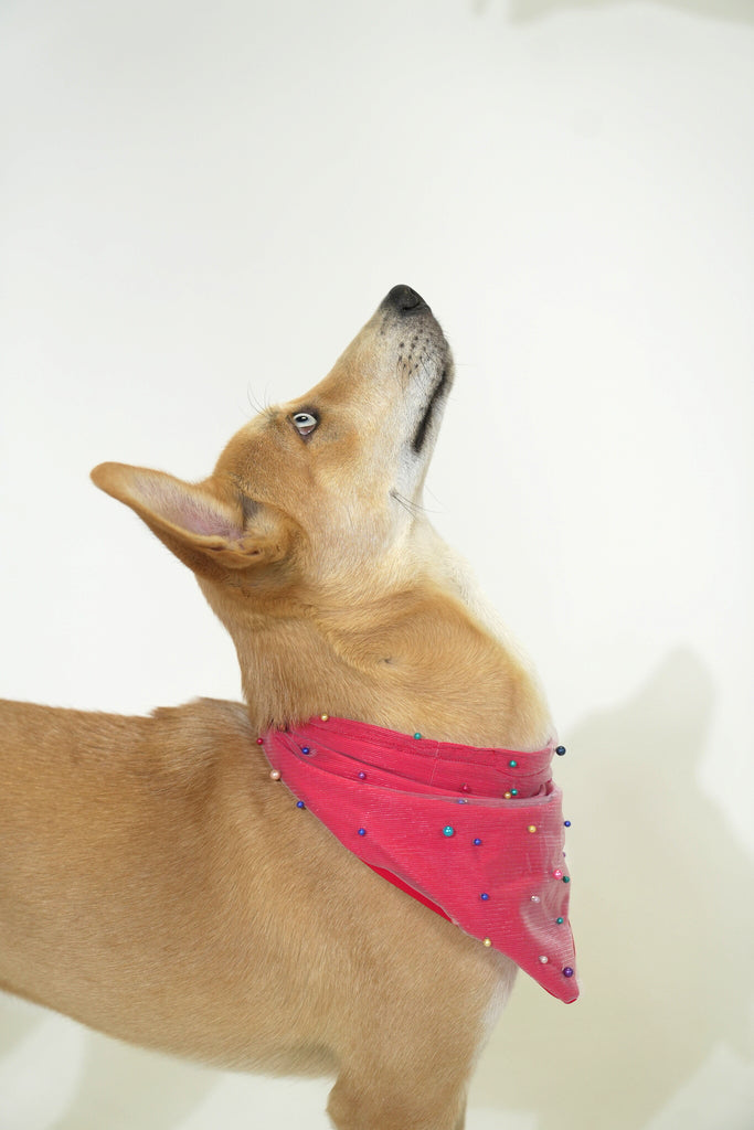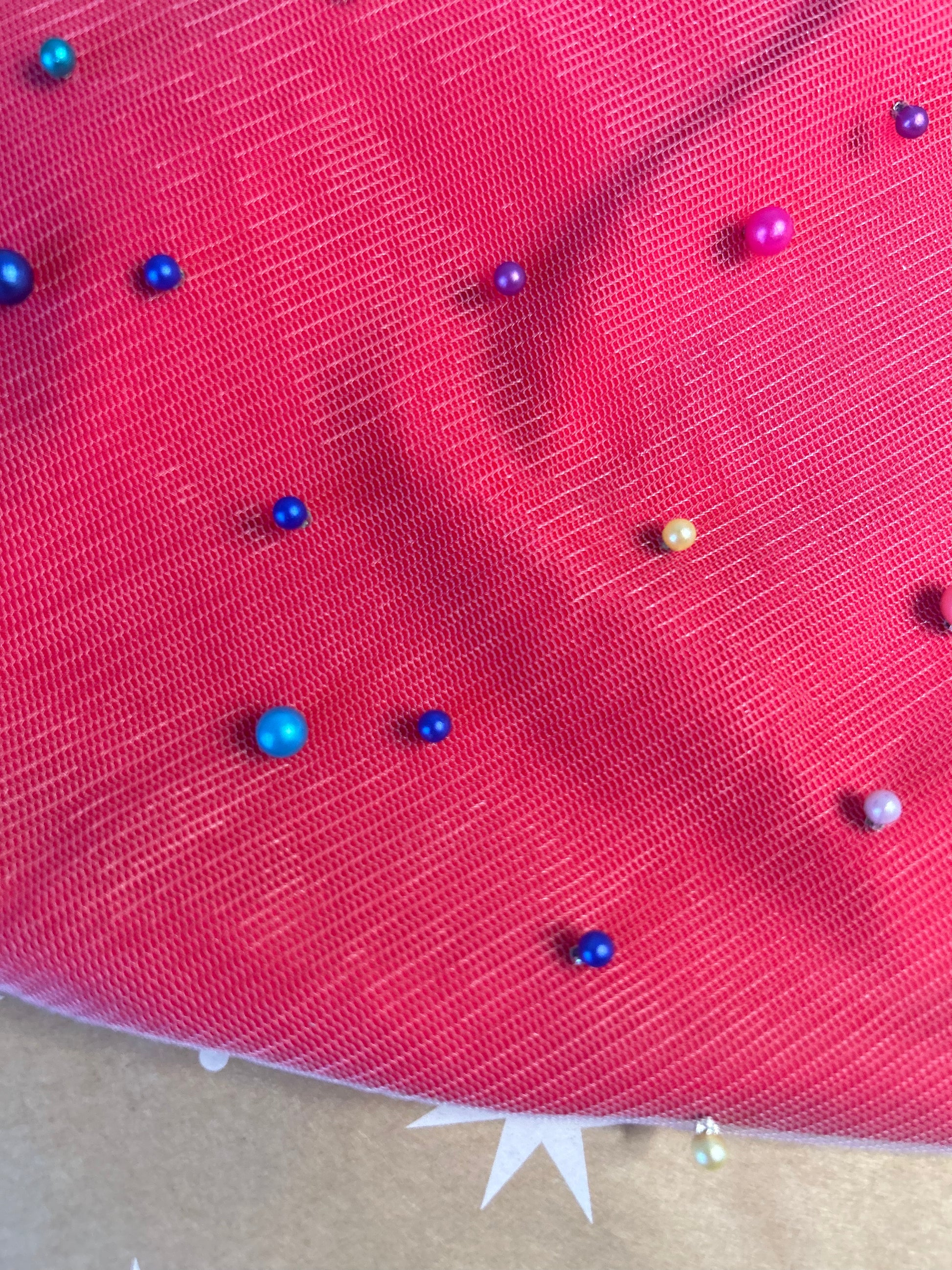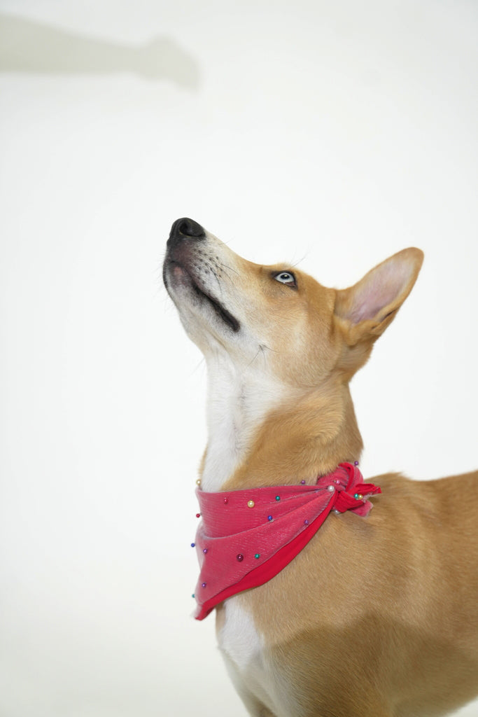 Byron is wearing a Red TECHNO SCUBA neoprene scuba fabric, accented with a veil of mesh and delicate decorations reminiscent of tiny Christmas ornaments. An ideal festive fashion choice!