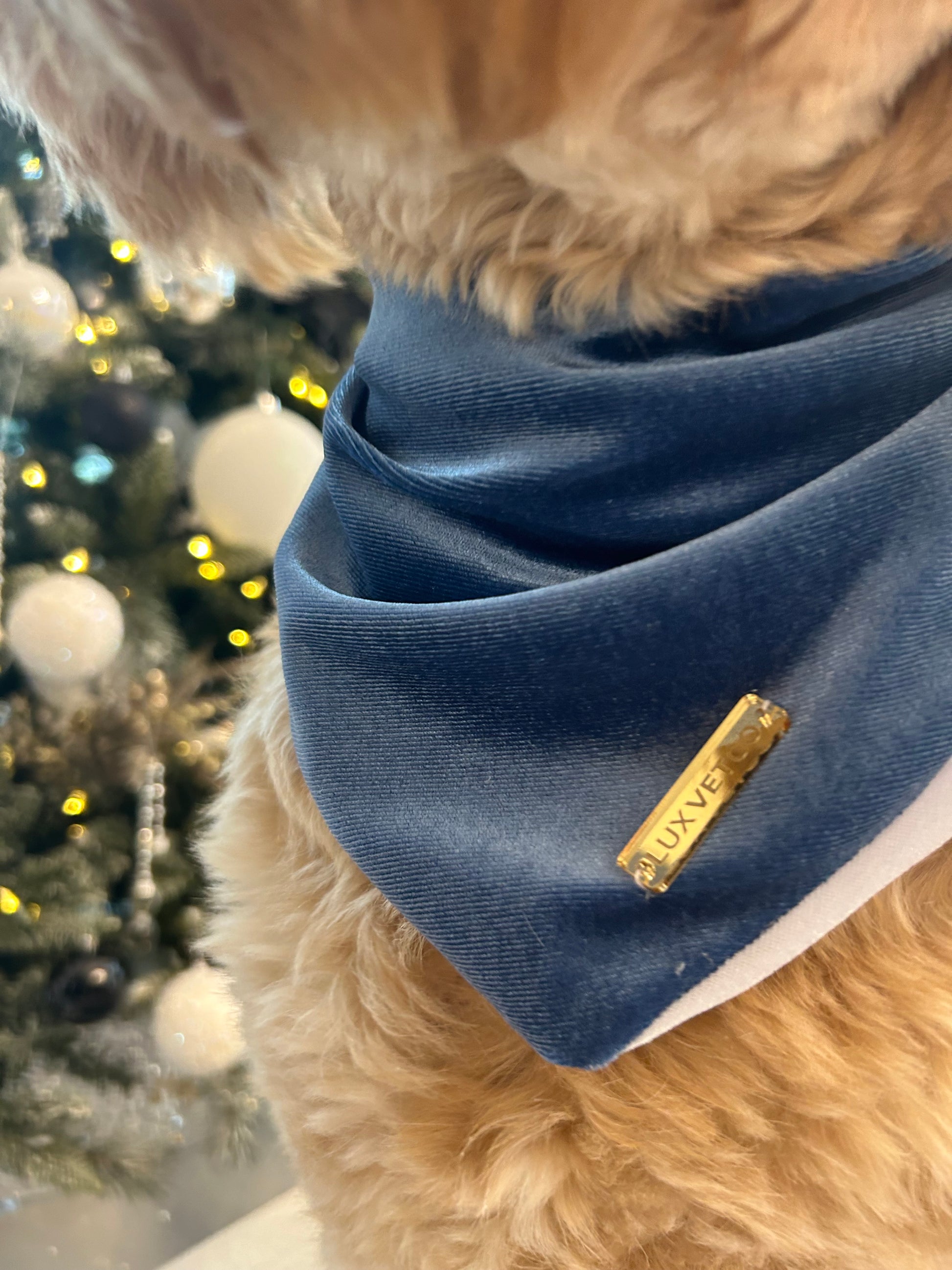 Byron proudly sports a sublime ocean blue velvet Christmas bandana, complete with a glimmering, hand-sewn Luxvetco label.